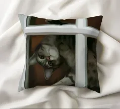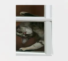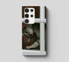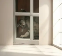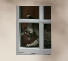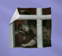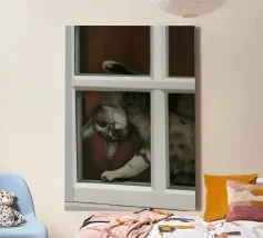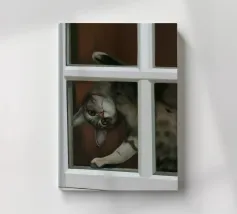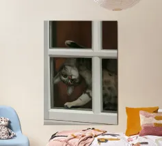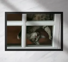 Un dipinto affascinante e giocoso che cattura un candido momento felino. Un curioso gatto soriano scruta attraverso il vetro di una finestra, con la testa inclinata all'insù nel classico modo malizioso. I toni tenui dell'interno e la pennellata morbida contrastano con la geometria nitida della cornice della finestra, creando un'atmosfera intima e accogliente. Con la sua posa espressiva e il suo sottile umorismo, quest'opera dona calore e allegria a qualsiasi spazio: perfetta per gli amanti dei gatti, gli appassionati di arredamento e i collezionisti di opere d'arte ispirate agli animali domestici.