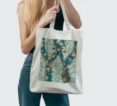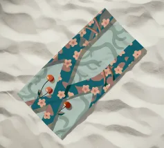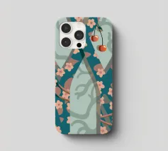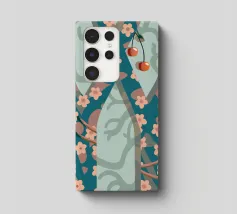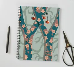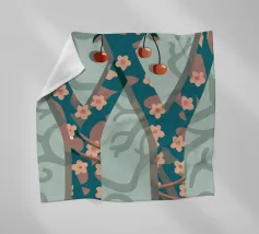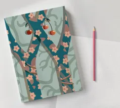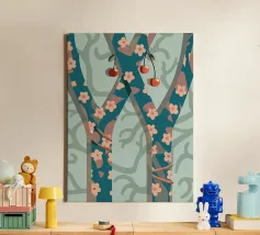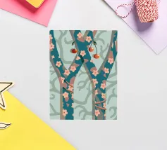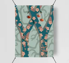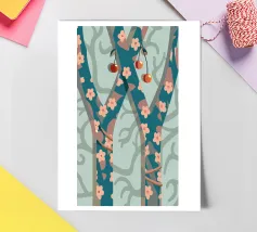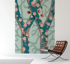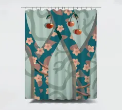Questa splendida illustrazione presenta un rigoglioso albero di ciliegio con frutti rossi pendenti, che crea un'atmosfera pacifica e rasserenante.