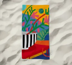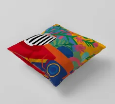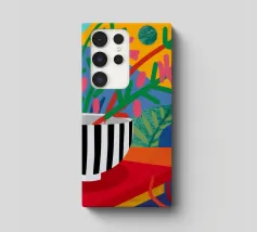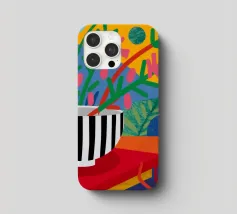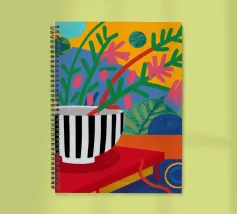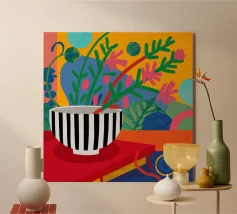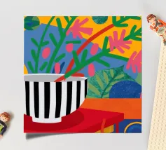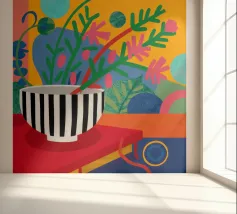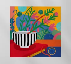 Una vivace natura morta astratta incentrata su una ciotola a righe bianche e nere, circondata da un tripudio di fiori, foglie e forme colorate.