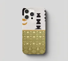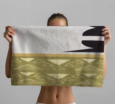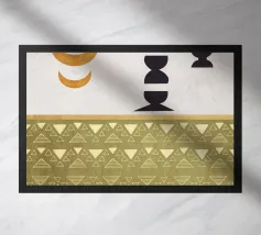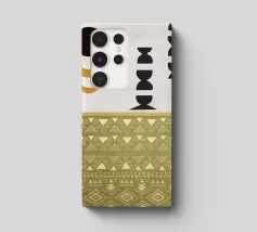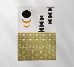 Forme geometriche, tra cui cerchi e mezzelune, sono disposte in uno stile minimalista su uno sfondo strutturato. Una sezione a motivi presenta file di triangoli e rombi nei toni della terra.