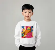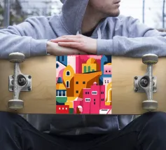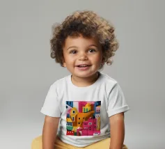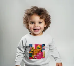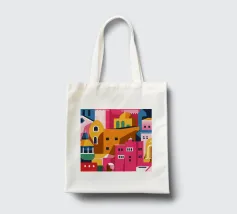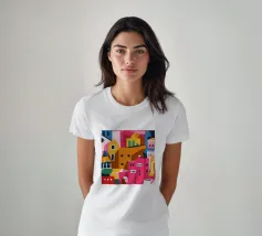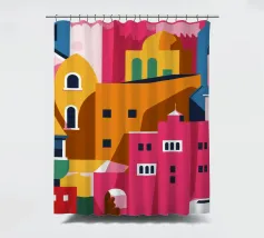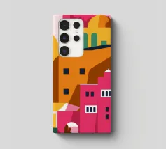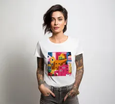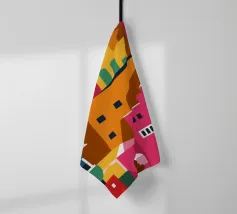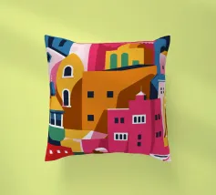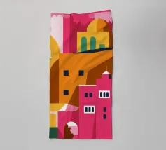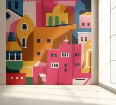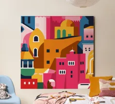 Una rappresentazione astratta e vivace di una città collinare con case colorate e a blocchi nei toni del rosa, del giallo e dell'arancione. La composizione è un'interpretazione moderna, energica e gioiosa di un villaggio mediterraneo.