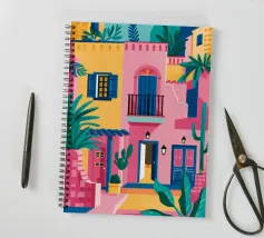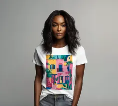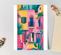 Una vivace illustrazione di una colorata città collinare, con case, scale e piante molto vicine. La scena è una rappresentazione vivace, gioiosa ed energica di una comunità mediterranea o sudamericana.