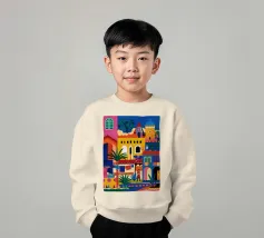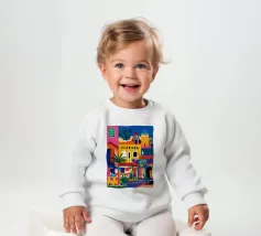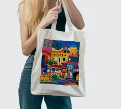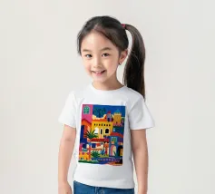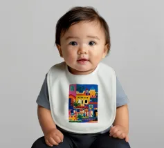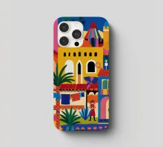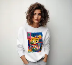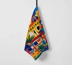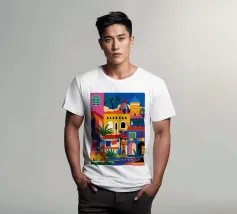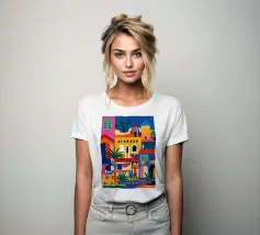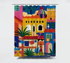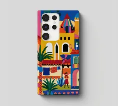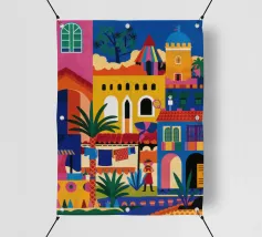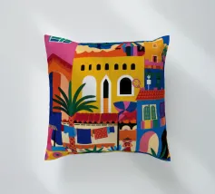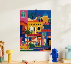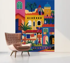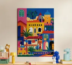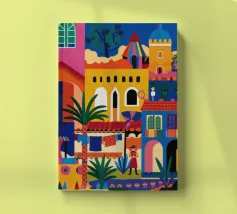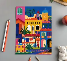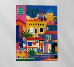 Un'illustrazione vivace ed energica di una colorata città collinare, con case, scale e piante ben strette. La scena è una rappresentazione vivace, gioiosa e bella di una comunità mediterranea o sudamericana.