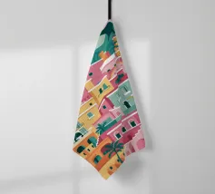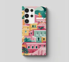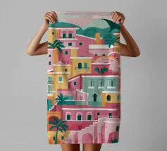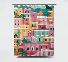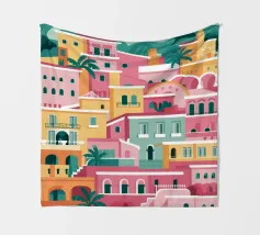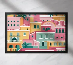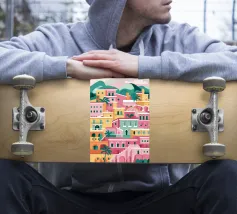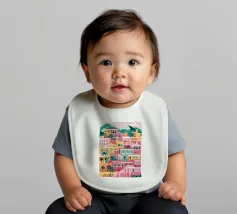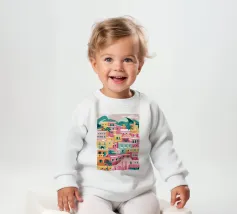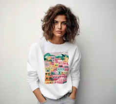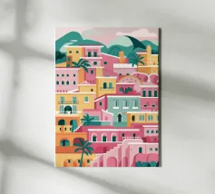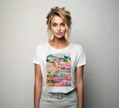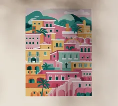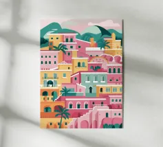 Una vivace rappresentazione di una città densamente popolata di edifici colorati si arrampica su una collina sotto un cielo morbido, resa con uno stile illustrativo e giocoso, che evoca un paesaggio urbano stravagante.
