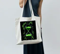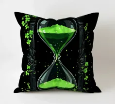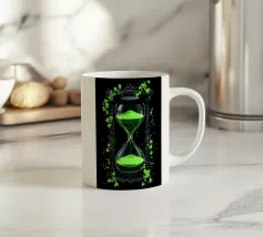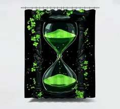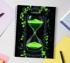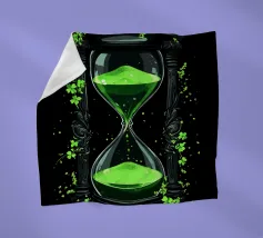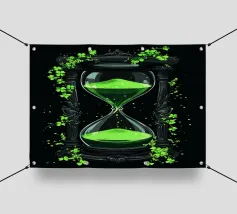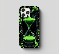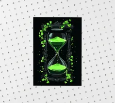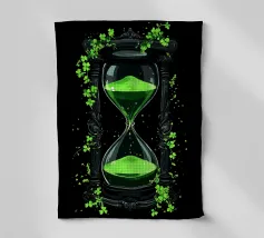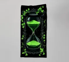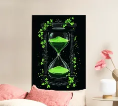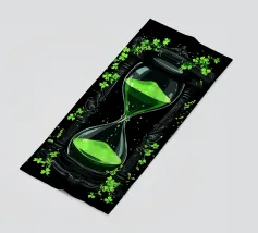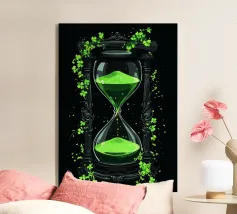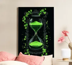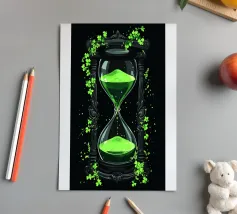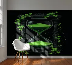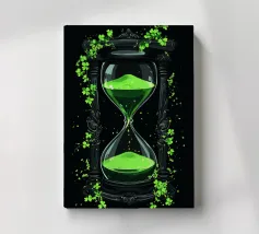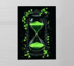 Clessidra artisticamente decorata con cornice nera e sabbia verde brillante. Vite e trifogli ne avvolgono la forma. L'immagine combina elementi del tempo, della natura e del simbolismo della felicità.