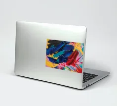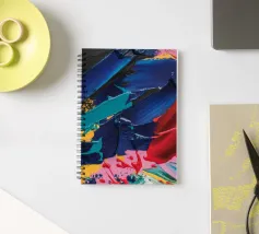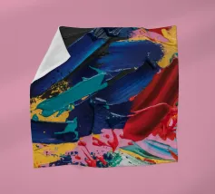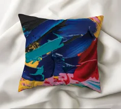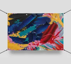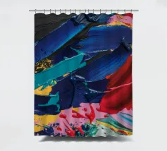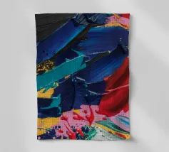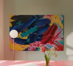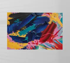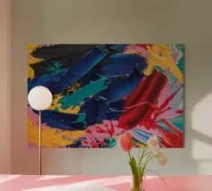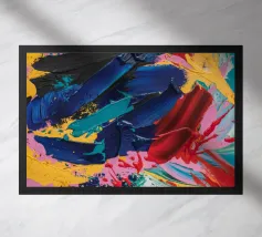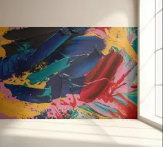 Un'intensa opera astratta con schizzi dinamici e spesse pennellate di blu cobalto, rosso, giallo e nero, che suggeriscono una furiosa esplosione di energia o un'esplosione caotica e colorata.