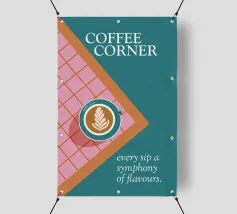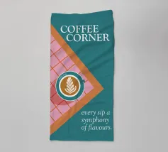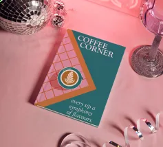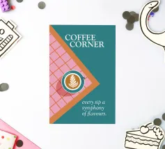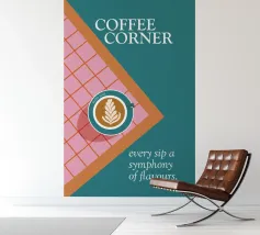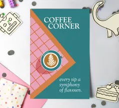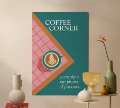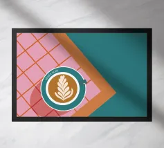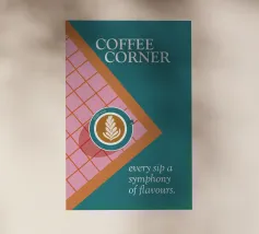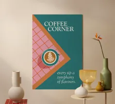 Un gioiello visivo per gli amanti del caffè: questo poster mostra una tazza di latte art su un pavimento di piastrelle rosa e rosse, incorniciato da un ricco colore turchese. La composizione sembra una vista dall'alto, direttamente nel momento in cui inizia il piacere. Il claim "Ogni sorso una sinfonia di sapori" riassume il concetto: qui il caffè non si beve soltanto, ma si celebra. Un design che unisce calore, stile e gusto. ✨ Simbolismo e umore Il piacere del caffè come rituale. Colori che svegliano. Tipografia che invita a entrare. Un design per tutti coloro che vogliono trasformare il loro luogo preferito in un angolo del caffè.
