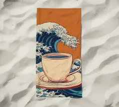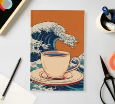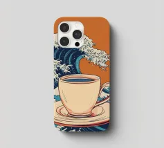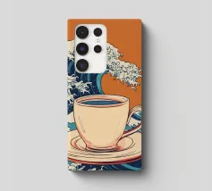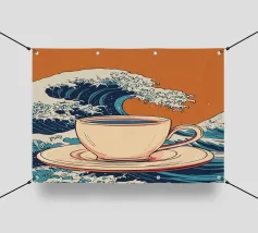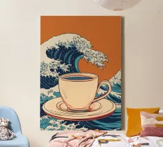 Un'illustrazione stilizzata raffigura una tazza e un piattino da caffè bianchi appoggiati su una grande onda che si infrange. L'onda è resa nel classico stile giapponese della stampa su blocco di legno, con sfumature di blu, bianco e arancione. Lo sfondo è in tinta unita arancione, creando un contrasto vibrante con il blu e il bianco dell'onda.
