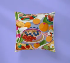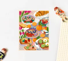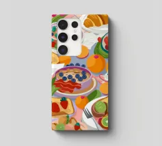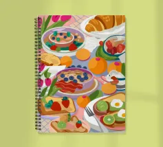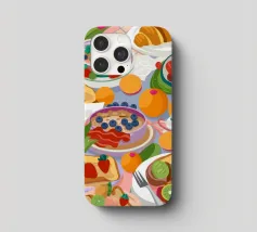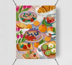 Un tavolo pieno di opzioni per la colazione, come dolci, frutta e bevande, fa da cornice a un'esposizione vivace e appetitosa.