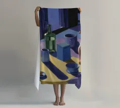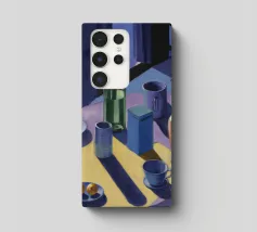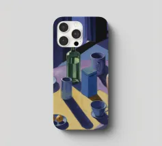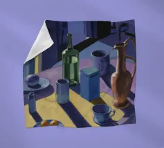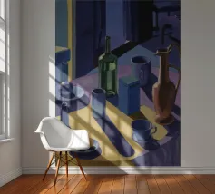 Una lunatica scena mattutina di tazze, bottiglie e piatti immersi in drammatiche ombre viola attraverso la luce della finestra.