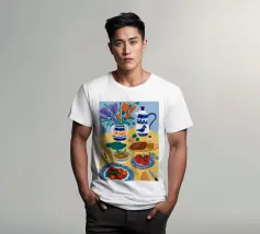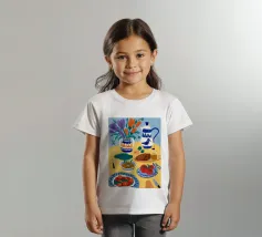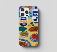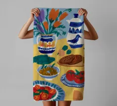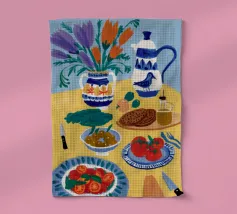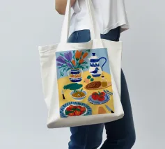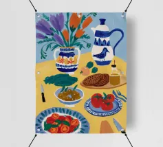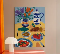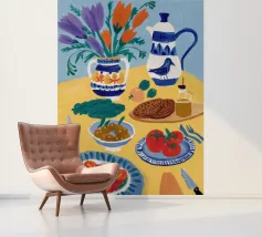 Una vivace natura morta di un tavolo da colazione con una brocca blu a fantasia che contiene fiori, pane, frutta e caffè, su uno sfondo giallo. Lo stile è colorato, illustrativo e allegro.