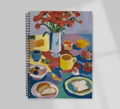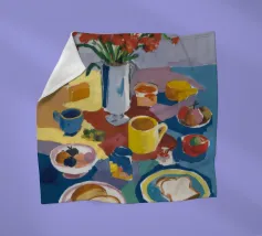 Una bella natura morta di una colazione su un balcone con vista sul mare, con caffè, pane e fiori, che cattura una perfetta mattina di vacanza.