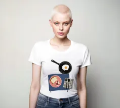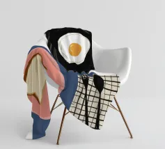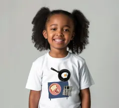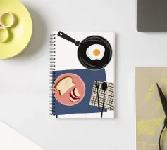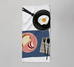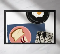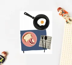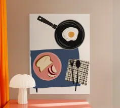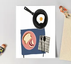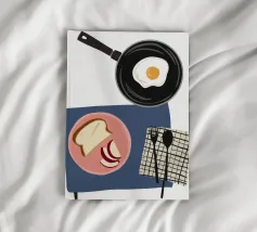 Un'illustrazione semplice e grafica di un uovo fritto in una padella, con un lato di pane tostato su una griglia di raffreddamento. La composizione minimalista e le linee pulite creano un'ode chic e moderna alla semplice perfezione della colazione.