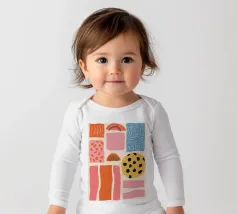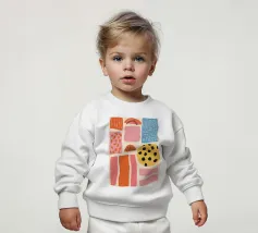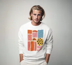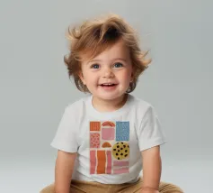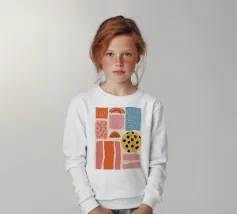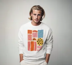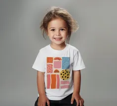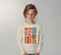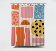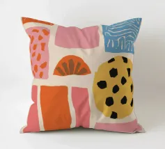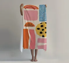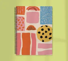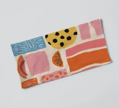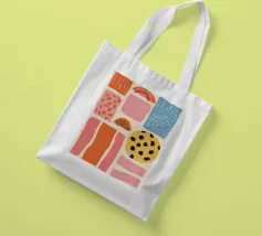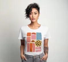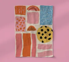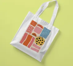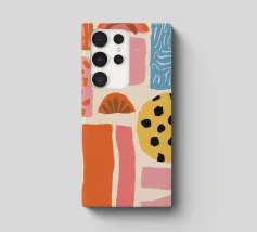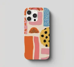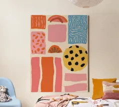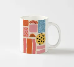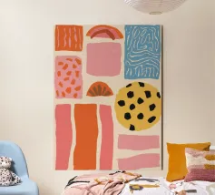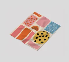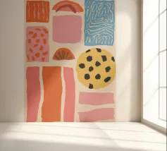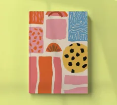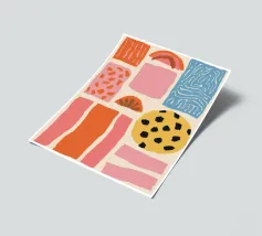 Un collage astratto di varie forme organiche con diversi motivi e texture, tra cui punti, strisce e colori solidi. La tavolozza calda e terrosa crea una composizione sofisticata e tattile.