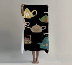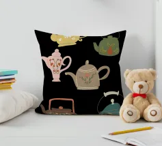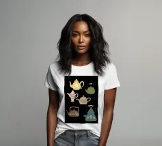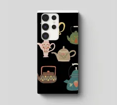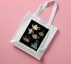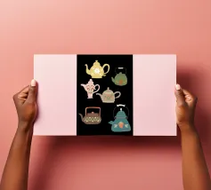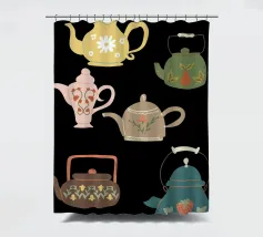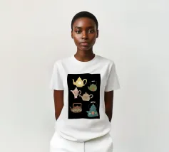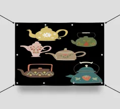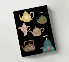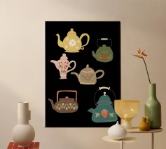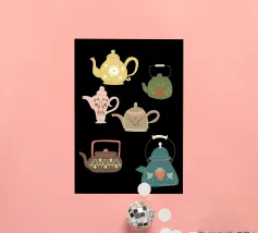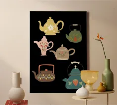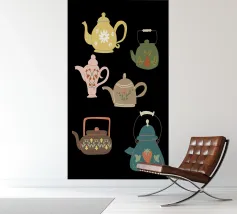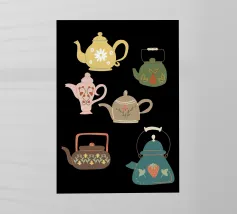 È esposta una collezione di sei estrose teiere, ciascuna decorata con motivi floreali e di frutta unici. I disegni presentano forme e colori diversi, creando un tema giocoso e affascinante.