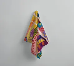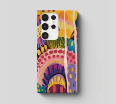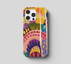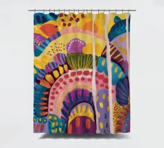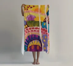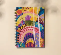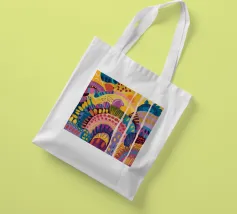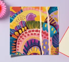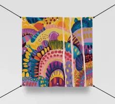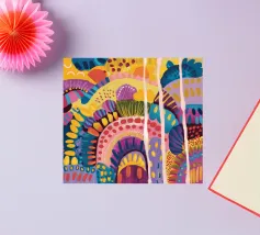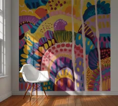 Un paesaggio astratto stravagante e colorato, caratterizzato da dolci colline e forme stilizzate in un arcobaleno di tonalità. Le linee fluide e la tavolozza vibrante creano un senso di gioia immaginativa e armonia naturale.