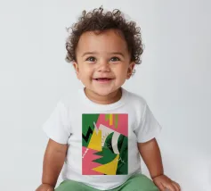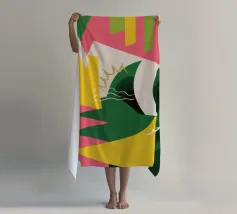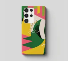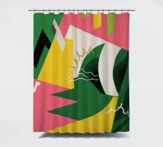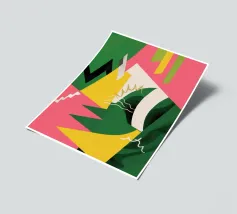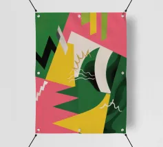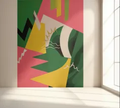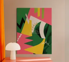 Un'energica opera d'arte astratta composta da frammenti di verde, giallo, rosa e nero che si scontrano tra loro. La composizione dinamica crea un senso di caos controllato e di energia moderna e tagliente.