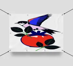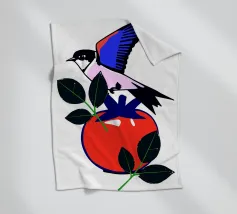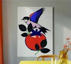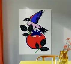 Un uccello colorato con ali blu e rosse è appollaiato su un frutto rosso, accompagnato da foglie verdi. La composizione è vivace, con colori vivaci e forme semplici.