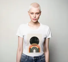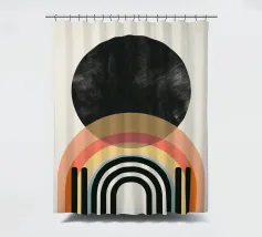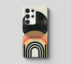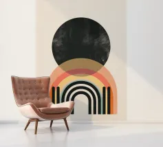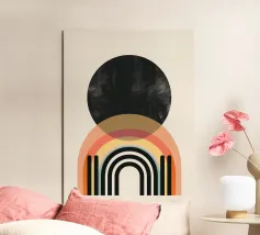 Questa moderna opera d'arte ispira con un impressionante gioco di colori audaci e forme geometriche chiare. Un grande cerchio nero si armonizza perfettamente con archi semitrasparenti in arancione, beige e blu, creando profondità ed equilibrio. Il design minimalista è elegante e senza tempo e si adatta perfettamente agli stili di arredamento moderni come il boho, lo scandinavo o l'urban chic. Ideale come murale, tazza, cover per cellulare o cuscino: un'ispirazione per ogni casa e un regalo unico.