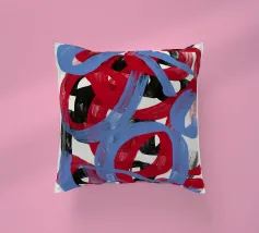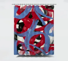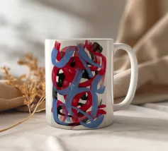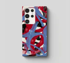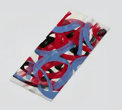 Audaci tratti rossi e blu si incrociano e si intrecciano tra loro su uno sfondo bianco, creando un senso di movimento ed energia. Alcuni tratti neri aggiungono contrasto e profondità alla composizione, che appare spontanea ed espressiva.