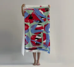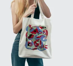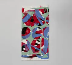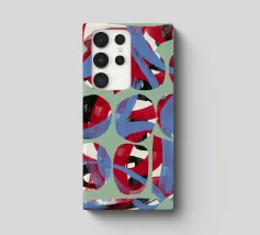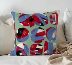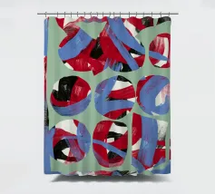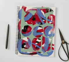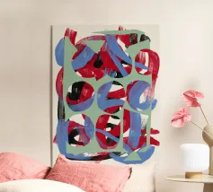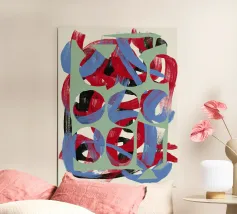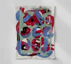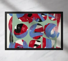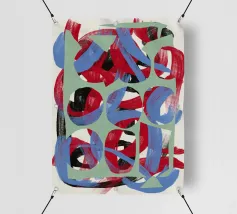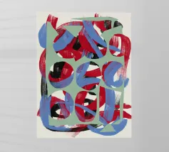 Audaci pennellate rosse e blu creano un disegno astratto su uno sfondo chiaro, intervallato da macchie di nero. Una forma verde chiaro, che ricorda un reticolo, si sovrappone a parte della composizione, contribuendo all'astrazione e alla profondità.