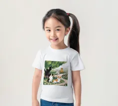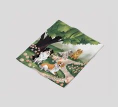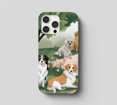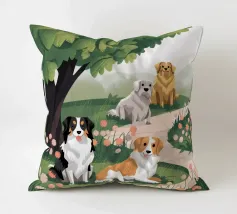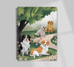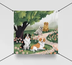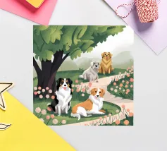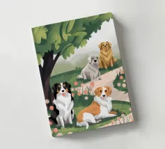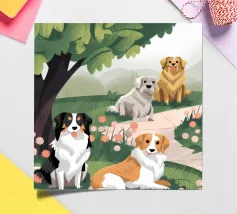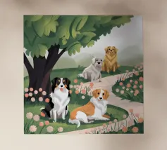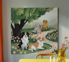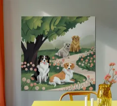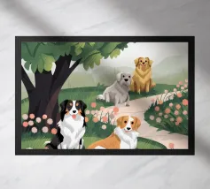 Tre cani riposano tranquillamente su un sentiero del giardino incorniciato da fiori e alberi. La composizione serena evidenzia un momento di pace e di cameratismo naturale.