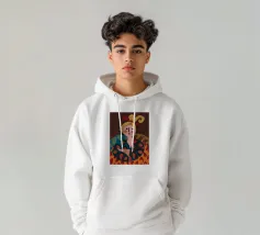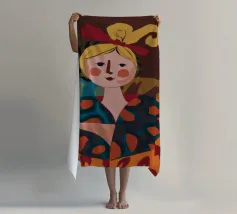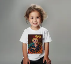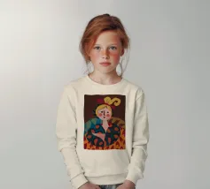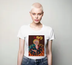 Questa illustrazione mostra una persona con i capelli grigi che indossa un maglione a righe colorate, con uccelli appollaiati sulle spalle e sulla testa. Lo sfondo rosa e gli elementi giocosi creano un'atmosfera stravagante e gioiosa.