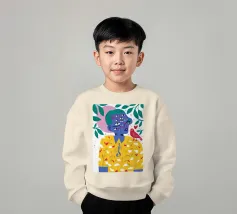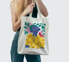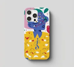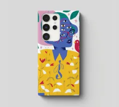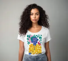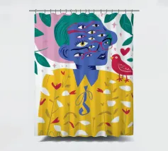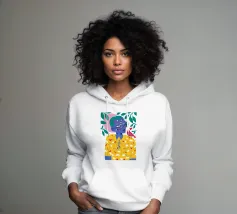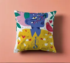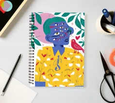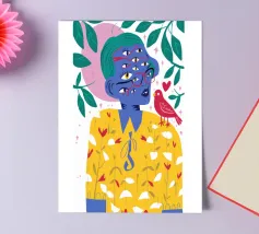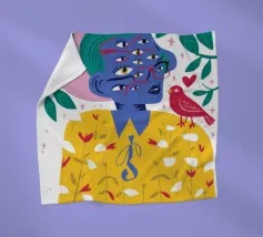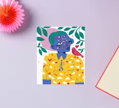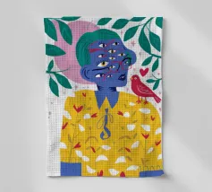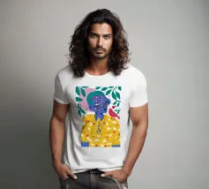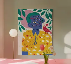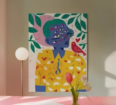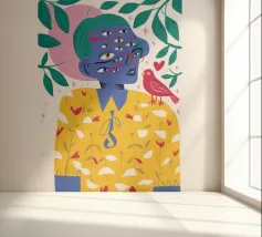 Ritratto di una persona con segni espressivi e colorati sul viso, che indossa un maglione giallo a fantasia. Un piccolo uccello rosso si posa sulla sua spalla, suggerendo un legame poetico e armonioso con la natura.