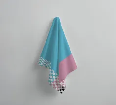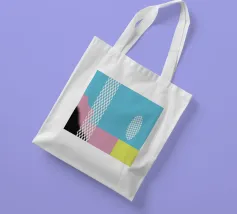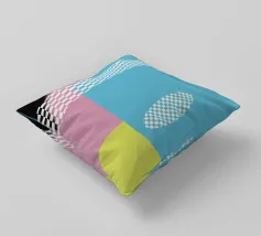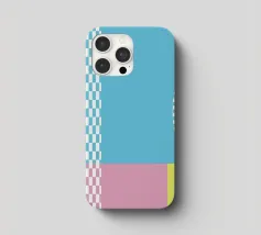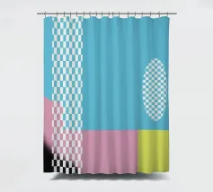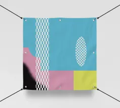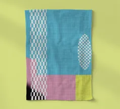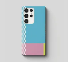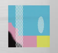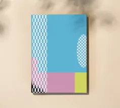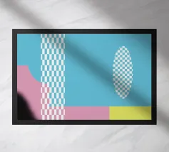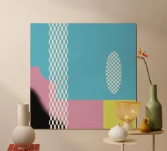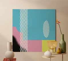 Forme geometriche e colori vivaci creano una composizione visiva dinamica, con aree blu, rosa e gialle intersecate da motivi a scacchiera. Una forma ovale aggiunge un interessante punto focale sullo sfondo strutturato.