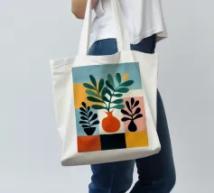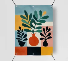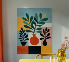 Questa elegante composizione botanica fonde la tecnica della silhouette di Matisse con il design di metà secolo. Le forme organiche delle piante danzano davanti a blocchi di colore geometrici nelle calde tonalità della terracotta, del senape e del blu. Lo stile ricorda i disegni tessili scandinavi degli anni '60 e crea un'atmosfera rilassante ma vivace. Le silhouette essenziali e la palette di colori armoniosi rendono questo pezzo perfetto per gli spazi moderni che combinano un'eleganza naturale con un'estetica senza tempo.