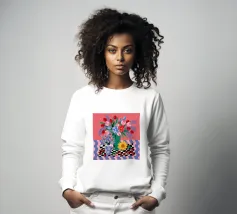 Un vivace bouquet di fiori multicolori si adagia elegantemente in un vaso blu sopra una tovaglia a scacchi. Il mix di tonalità rosa e viola dello sfondo esalta la ricca composizione cromatica.