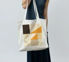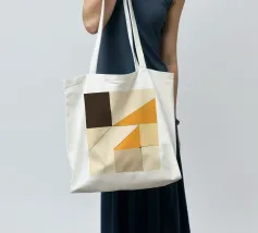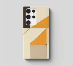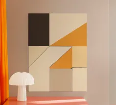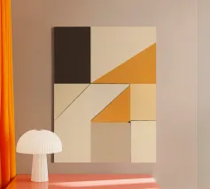 Forme geometriche nei toni del beige, del crema e dell'arancione si intersecano con linee decise, creando una composizione astratta e moderna. L'uso di blocchi di colore e di angoli dà un senso di profondità e struttura.