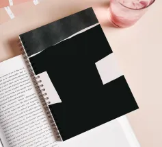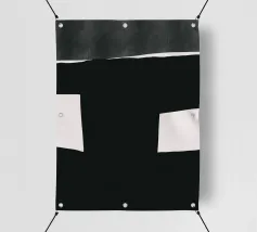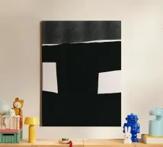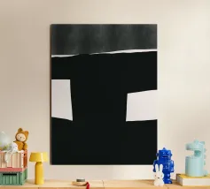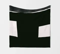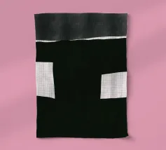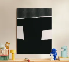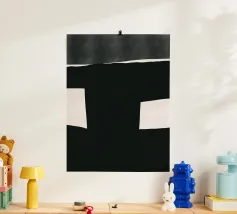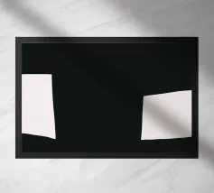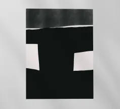 Una composizione minimalista mostra forme geometriche chiare e scure in contrasto su uno sfondo strutturato. Il design essenziale enfatizza la semplicità e la forma, creando un forte impatto visivo.