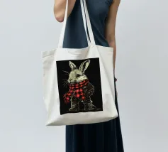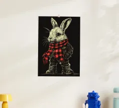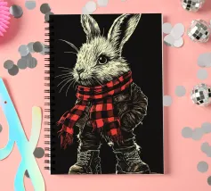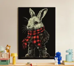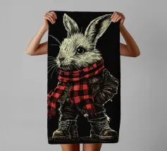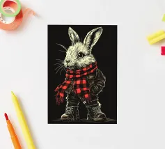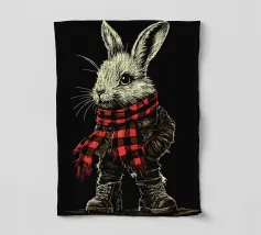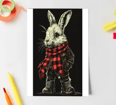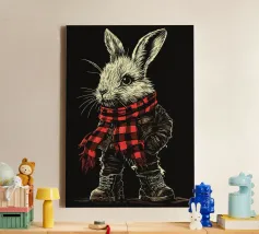 Un coniglio in piedi indossa una giacca di pelle e una sciarpa a scacchi rossi e neri. L'abbigliamento conferisce all'animale un aspetto urbano e sicuro di sé. Un'insolita miscela di carineria e attitudine rock.