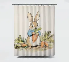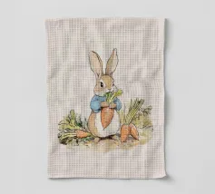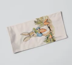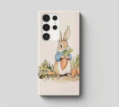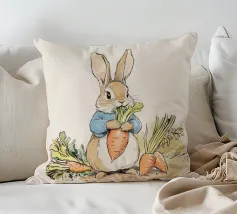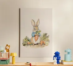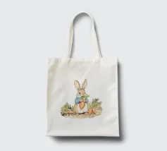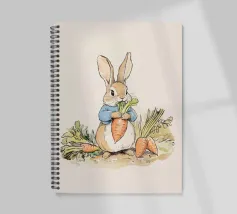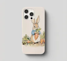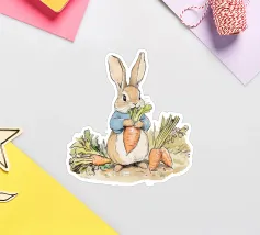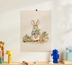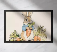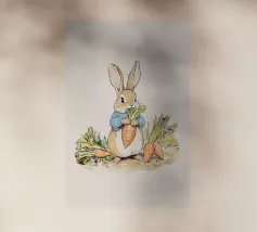 Illustrazione di un coniglio con una giacca blu, che tiene in mano una grande carota con diverse altre carote intorno, evocando lo stile classico dei libri per bambini.