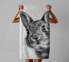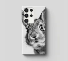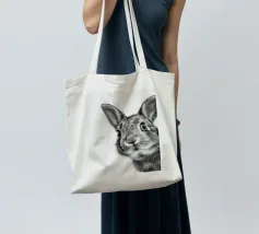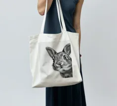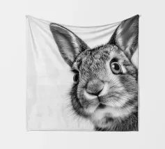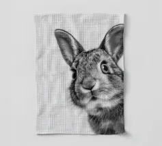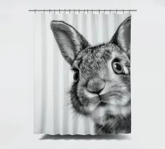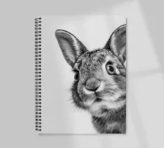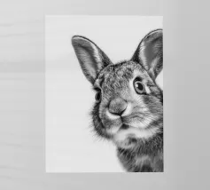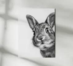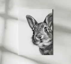 Un simpatico ritratto di un coniglio con grandi occhi curiosi e morbide orecchie a sventola. Con la sua pelliccia bianca e nera, irradia gioia e curiosità sullo sfondo bianco, perfettamente catturato nella fotografia realistica degli animali.