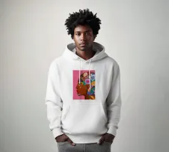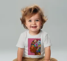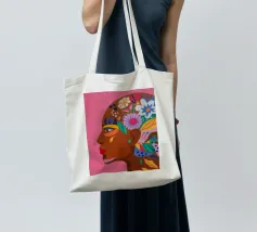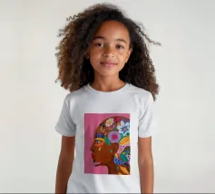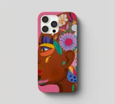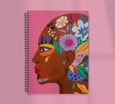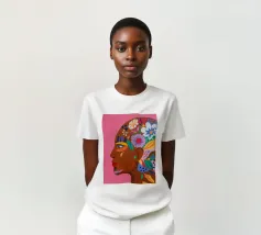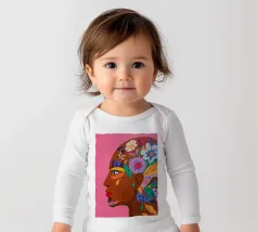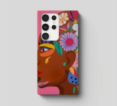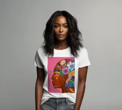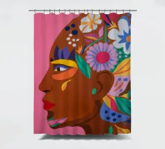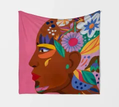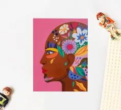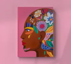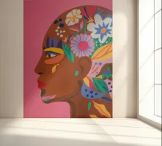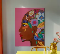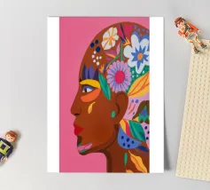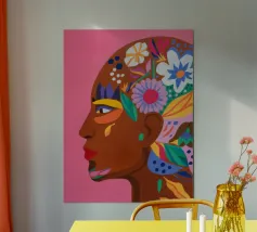 Questo dipinto mostra il profilo laterale di una persona dalla pelle scura, adornata da intricati e colorati motivi floreali. Lo sfondo è di un rosa acceso, che mette in risalto il disegno dettagliato e vivace sulla testa della persona.