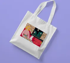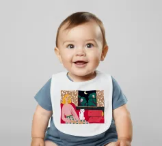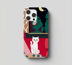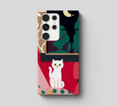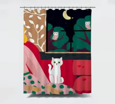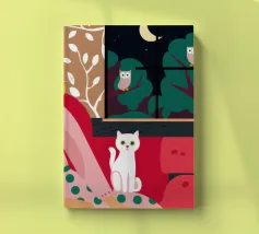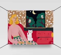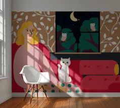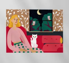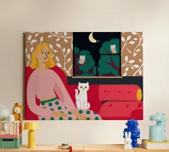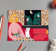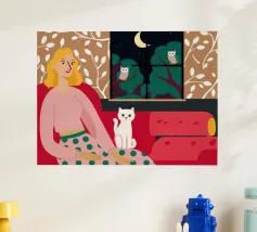 Una donna con un maglione rosa siede su un divano rosso con il suo gatto bianco, entrambi guardano fuori dalla finestra la luna crescente e le stelle, condividendo una notte tranquilla e contemplativa.