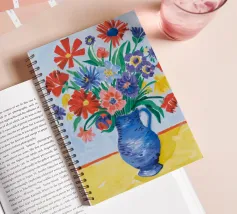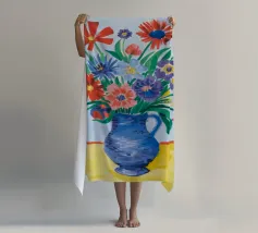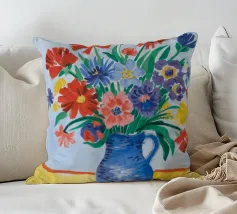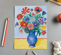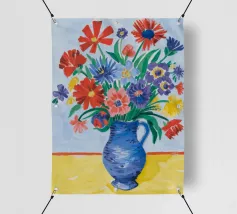 Un ricco e vibrante bouquet di fiori misti, tra cui papaveri rossi e fiordalisi blu, in un classico vaso blu. La composizione è piena e abbondante su uno sfondo blu chiaro, che celebra la bellezza di un raccolto di fiori selvatici.