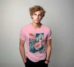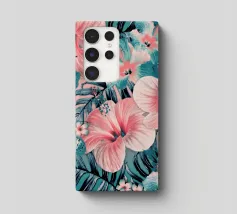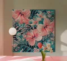 Collage di pittura digitale di un giardino tropicale in coralli vintage e verde giada con fiori di ibisco, farfalle e plumeria.
