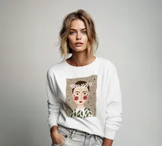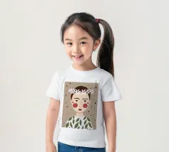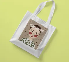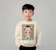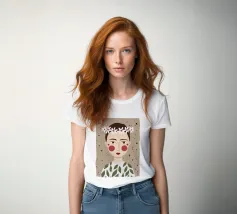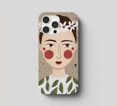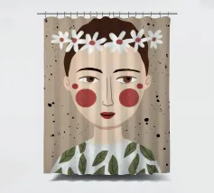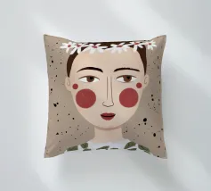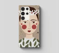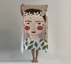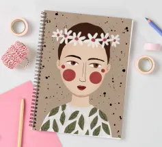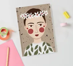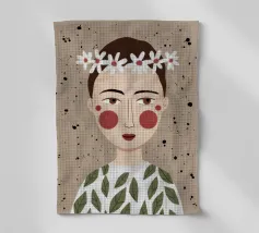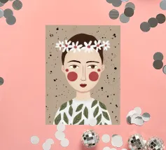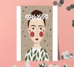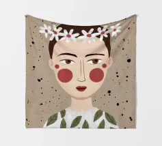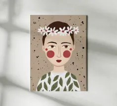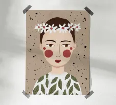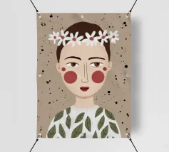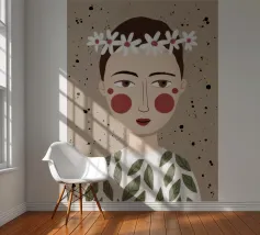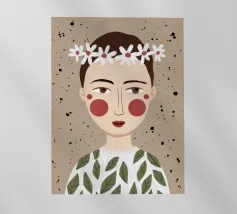 Delicato ritratto di una persona dai corti capelli castani che indossa una corona di margherite bianche. Lo sfondo è di un morbido beige maculato, che conferisce all'opera un'atmosfera rustica e tenera.