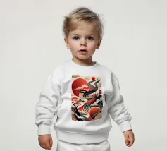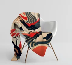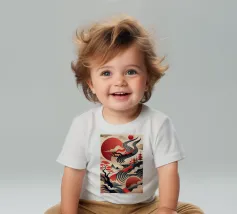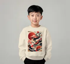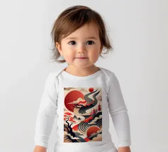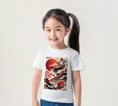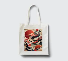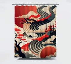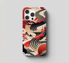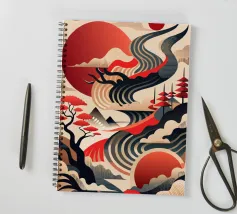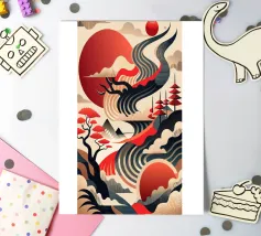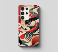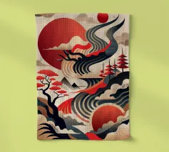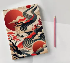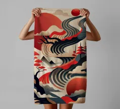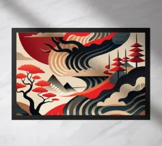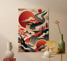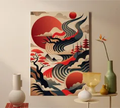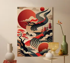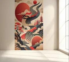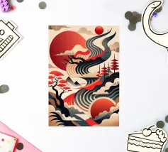Un paesaggio astratto vibrante e dinamico ispirato all'estetica giapponese, con fiumi che scorrono, montagne imponenti e un sole che sorge.