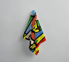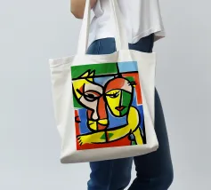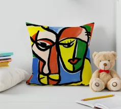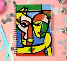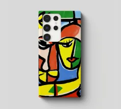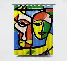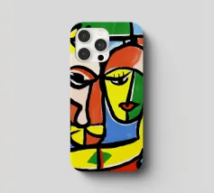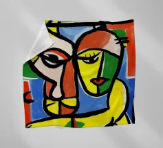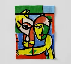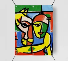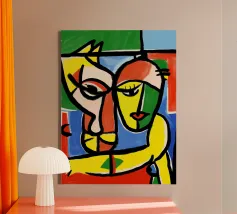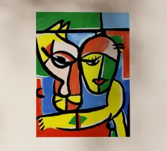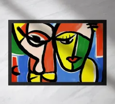 Una vibrante rappresentazione astratta mostra due volti con linee prominenti e colori contrastanti strettamente intrecciati. I tratti decisi e la tavolozza vivace conferiscono una qualità espressionistica alle figure, creando un'esperienza visiva di grande impatto.