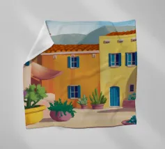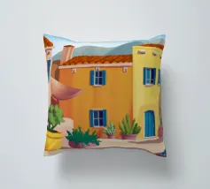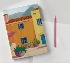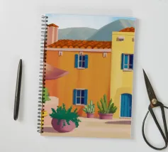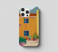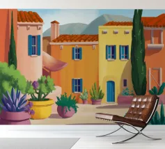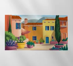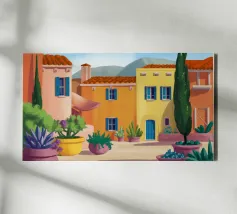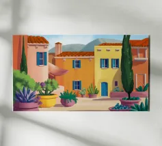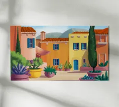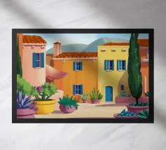 Un sereno cortile mediterraneo con vasi di terracotta, alberi di agrumi e fiori colorati, con i tradizionali edifici gialli e blu sullo sfondo, che creano un rifugio tranquillo e soleggiato.