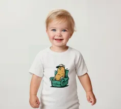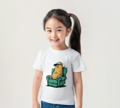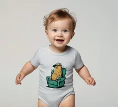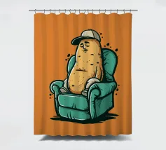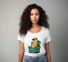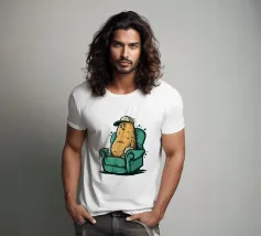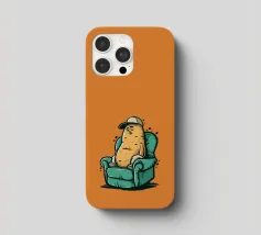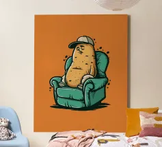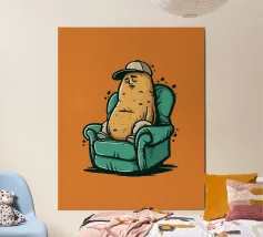 Illustrazione a fumetti di un personaggio a forma di patata con un berretto, comodamente sdraiato su una poltrona verde su un vivace sfondo arancione. La posa rilassata e i dettagli espressivi trasmettono umorismo e pigrizia in un disegno spensierato.