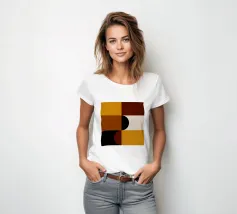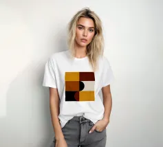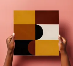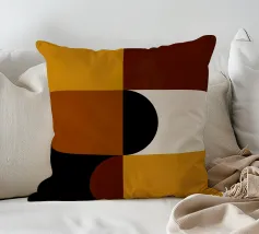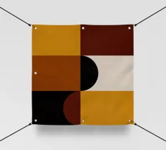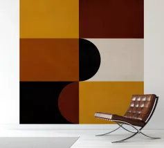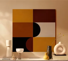 Questo pezzo di ispirazione Bauhaus unisce le calde tonalità del marrone e del senape con audaci forme geometriche per un'accogliente atmosfera da metà del secolo scorso. Perfetto per aggiungere un tocco di fascino retrò e di equilibrio moderno a qualsiasi spazio.