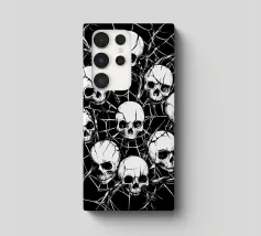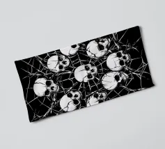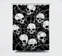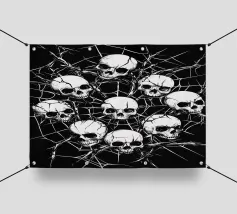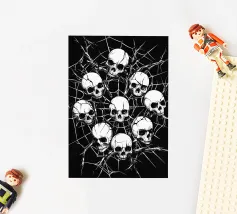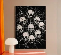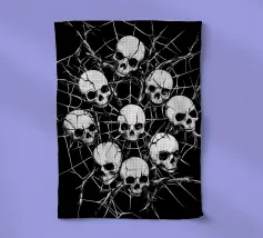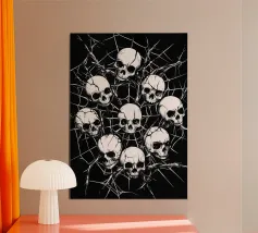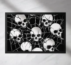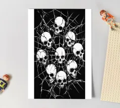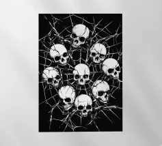 Diversi teschi sono appesi in una ragnatela di ragnatele e rami spinosi. La scena è in bianco e nero e appare oscura e misteriosa per la ricchezza dei dettagli. Un motivo a metà tra l'incubo e l'opera d'arte.