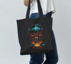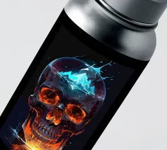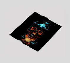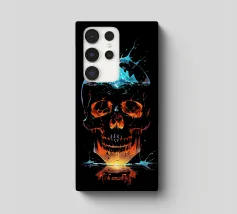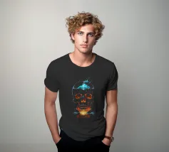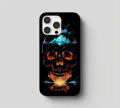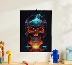 Una vibrante rappresentazione di un teschio dal cuore infuocato, in contrasto con un gelido paesaggio montano alla sua sommità, come se fosse racchiuso in un guscio traslucido. La giustapposizione di fuoco e ghiaccio crea un effetto visivo di grande impatto, sottolineando i temi della dualità e dell'equilibrio. Lo sfondo scuro accentua ulteriormente i colori vivaci e l'energia dinamica della scena.