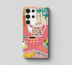 Una bella e abbondante natura morta di un tè, con una teiera, tazze, una ciotola di fragole e altri frutti su una tovaglia di percalle. La scena è fresca, affascinante e una gioiosa celebrazione di una pausa piacevole.