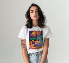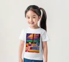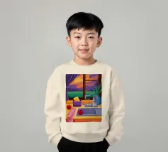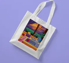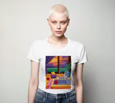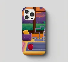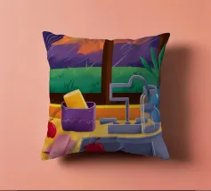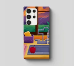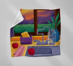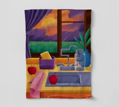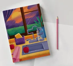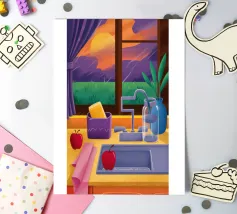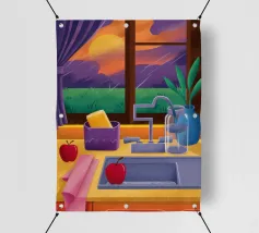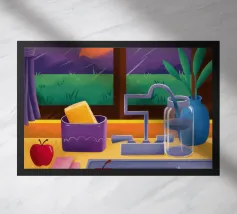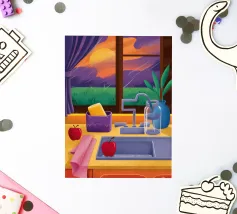 Un'illustrazione lunatica e d'atmosfera di una zona lavello della cucina al crepuscolo, con la finestra che mostra un cielo viola e arancione, creando una sensazione di quiete, di fine giornata.
